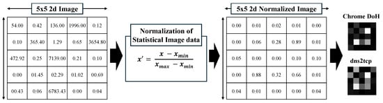 The 25 selected features undergo a MinMax normalization process, where their values are scaled between 0 and 1 according to Equation (1), as shown in Figure 3. After normalization, the features are arranged sequentially into a 5 × 5 vector, resulting in an image-like representation.