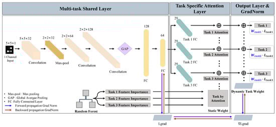 The proposed architecture leverages a shared network to learn common features across tasks, thereby enhancing the model’s generalization capability. Increasing the width of the shared network can further improve its ability to generalize; however, overly generalized shared features may lack robustness in capturing task-specific characteristics. To address this, the network incorporates dedicated task-specific layers, structured as a multi-task shared layer, a task-specific attention layer, and an output layer with GradNorm-based weight updates. The task-specific attention layer utilizes precomputed and fixed attention weights to assign feature importance for each task. These static attention weights guide the model in updating network parameters effectively, ensuring that each layer focuses on task-specific information based on pre-extracted features. Meanwhile, the output layer employs task-specific loss functions to compute final losses and predictions. In addition, the gradient norms of the final dense layer in the shared network are computed to compare the gradient norms across tasks. This enables dynamic updates of task weights using GradNorm, ensuring balanced learning among the tasks. The components and their detailed functionalities are described in the subsequent sections.
