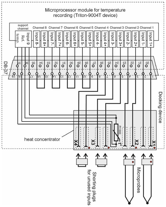 The sockets in the docking device are mounted on a copper heat concentrator, which also houses a precision temperature sensor (the platinum resistance thermometer PT-100). It measures the temperature of the reference junctions of the thermocouples, i.e., the reference temperature. The connection diagram of the microprobes to the microprocessor temperature meter is shown in Figure 2.