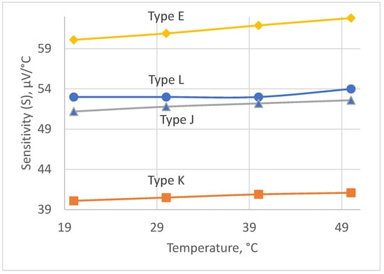 The choice of the thermocouple is governed by the following requirements: (i) the measurement range is 20–50 °C; (ii) a high sensitivity in the chosen range; and (iii) a high stability of its sensitivity. The four types of thermocouples that fit best these requirements are as follows: type E, type L, type K, and type J [,]. The plots of sensitivities versus measured temperature for the abovementioned types of thermocouples in the range of 20–50 °C are given in Figure 3.