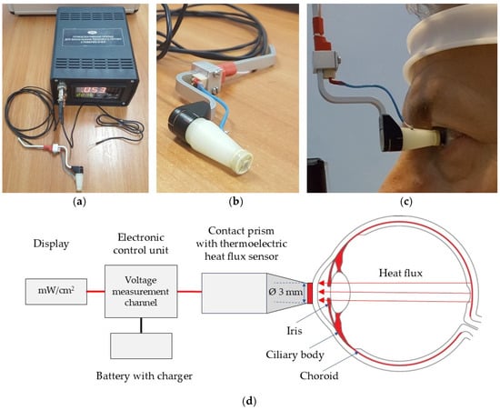 The thermoelectric device for determining the temperature and HF density of the human eye []. (a) Electronic control unit; (b) Thermoelectric HF sensor, located between two ceramic plates (3 mm in diameter); (c) The device attached to a slit lamp; (d) Schematic illustration of the device’s design and operation principle for measuring the HF density from the ocular surface.