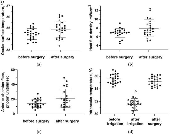 In the postoperative period, we observed an increase in the average values of OST and HF density of the eye, as well as asymmetry in the thermal characteristics of paired eyes, which indicates changes in the heat transfer of the operated eye. An increase in laser photometry indicators was recorded, which characterizes the state of the blood–ocular barrier and is an objective indicator of intraocular inflammation []. It has previously been reported that some patients after cataract surgery, glaucoma surgery, and vitreoretinal surgery had subclinical inflammation confirmed by laser photometry [,,]. We assume that the changes in the temperature and HF density on the ocular surface, recorded in the postoperative period, may be a consequence of postoperative inflammation (mostly subclinical) and the concomitant intensification of blood circulation in the choroid of the eye [,,]. The role of inflammation in changes in ocular heat exchange is also confirmed by the clinical picture in some patients. Thus, in three cases, clinical signs of inflammation were detected; increased laser photometry values were determined, caused by changes in the blood–ocular barrier due to the inflammatory process, as well as increased HF density values on the surface of the operated eye and the OST. The absence of clinical signs of infectious complications in these patients may indicate the aseptic nature of the inflammatory response of the eye tissues to surgical trauma [].