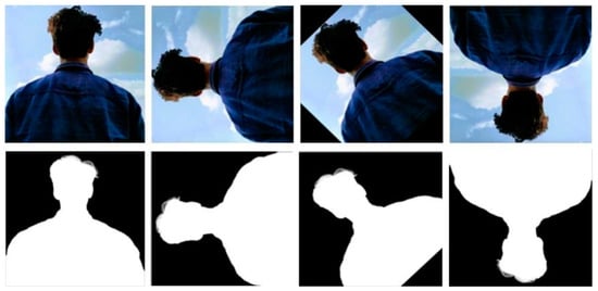 Data Enhancements: To further enrich our dataset, we employed a series of data enhancement techniques designed to mimic real-world variability. These enhancements included motion-related changes, such as scaling and rotation (Figure 4), as well as color adjustments (e.g., brightness and saturation), applied to preserve the natural integrity of the images [28]. To introduce temporal diversity in the video data, we incorporated techniques such as clip reversal and speed variations. Additionally, for static datasets such as VMD and PhotoMatte85, we created composite images by combining transparent background subject images with various backgrounds from the BG dataset (Figure 5). Each subject image was paired with 20 different backgrounds to ensure a realistic and representative mix. This process expanded PhotoMatte85 to 13,165 images and VMD to 89,227 images, simulating a wide range of portrait environments. Each step of our dataset assembly and augmentation was systematically structured and executed with the goal of developing a robust, diverse, and realistic dataset—essential for effective training and testing of our video portrait segmentation model.