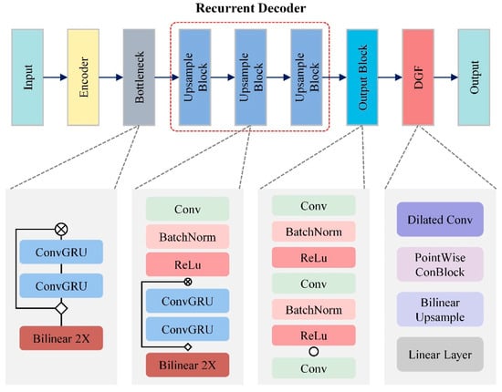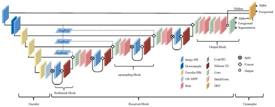 The RVM model functions as a real-time foreground segmentation framework for video scenes, employing a U-shaped architecture. It incorporates MobileNetV3-Large as an efficient backbone and utilizes the LR-ASPP module of MobileNetV3 for semantic segmentation tasks. The model architecture consists of a three-part encoder for frame feature extraction, a cyclic decoder for temporal information aggregation, and a depth-guided filter module for high-resolution upsampling, as illustrated in Figure 6.