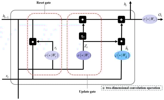 where represents the input data at the current time step, and represents the network’s memory or state at the current time step, which depends on the previous hidden state and the current input . denotes the sigmoid function, is the standard two-dimensional convolution operation, and denotes the Hadamard product. The parameters , , , and are the corresponding 3 3 convolution kernels.
