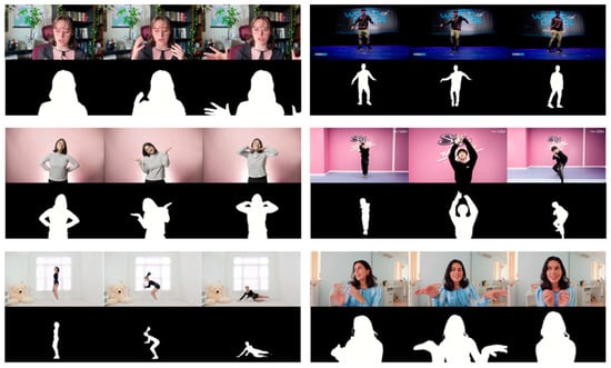 - Lin, S.; Ryabtsev, A.; Sengupta, S.; Curless, B.; Seitz, S.; Kemelmacher-Shlizerman, I. Real-Time High-Resolution Background Matting. In Proceedings of the 2021 IEEE/CVF Conference on Computer Vision and Pattern Recognition (CVPR), Nashville, TN, USA, 20–25 June 2021. [Google Scholar]