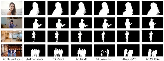 In our comprehensive evaluation, detailed in Table 5, we compared the performance of five segmentation models—BGMv2 [32], ConnectNet [33], DeepLabV3 [34], MODNet [35], and the extended RVM+ model—across multiple datasets. This comparison was designed to rigorously assess their segmentation accuracy and overall effectiveness in different scenarios. As the results show, the RVM+ model consistently outperformed the other models across all evaluated datasets. One of the notable achievements of the RVM+ model is its remarkable MIoU score of 0.974 on the VS-test set. This high MIoU indicates the model’s exceptional precision in distinguishing objects from the background, a critical aspect of segmentation accuracy. The RVM+ model also maintained the lowest SAD value of 5.81, indicating that the segmented portrait closely matches the ground truth. In contrast, while DeepLabV3 excels in network depth and multi-scale contextual understanding, it falls short in handling fine edges. MODNet achieves fast inference due to its lightweight design but lags behind RVM+ in detail preservation and edge clarity in complex scenes. ConnectNet’s performance falls between these two, showing good accuracy on certain datasets but still trailing behind RVM+ overall. In summary, these results convincingly demonstrate the superior performance of RVM+ in video portrait segmentation tasks, establishing its potential for high-fidelity segmentation applications.