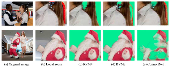 Figure 13 provides a detailed analysis of how RVM+ excels at capturing fine textures, hair strands, and facial details, emphasizing its ability to maintain high-quality segmentation results. BGMv2, while proficient in object segmentation, falls short in contour accuracy, occasionally resulting in minor mis-segmentation or blurred boundaries. ConnectNet, although adequate, tends to be less accurate than both RVM+ and BGMv2, exhibiting noticeable segmentation errors and reduced clarity in subject contours.