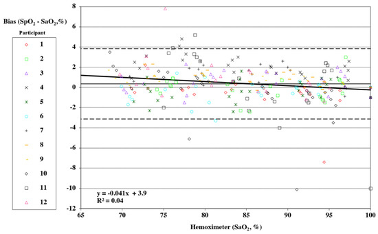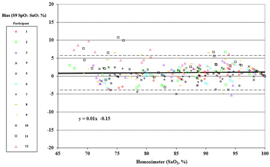 Pulse oximeter data were taken as one reading corresponding to the point of arterial blood analysis. Individual data points may have been missed or excluded for dropped signals or failure of the oximeter signal to achieve an appropriate plateau. Bias was computed as test device readings minus the corresponding arterial blood sample values. Bias was reported as the root mean square deviation (RMSD). Plots following Bland and Altman with adjustments for multiple measurements for each participant according to the “Method Where the True Value Varies” were generated [38]. The FDA guidance prescribes the use of a Bland Altman error plot with specifically calculated limits of agreement [23,24,38]. Data were plotted as hemoximeter data (SaO2) vs. pulse oximeter bias (SpO2–SaO2). A different marker was used for each study subject. Linear regression was calculated for all participants combined for each device tested, and the equation with R2 was included on a Bland Altman plot.