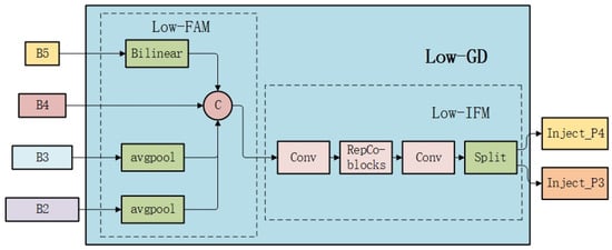 The low-GD module is mainly used to fuse the shallow feature information of the model to achieve efficient interaction of shallow features and distribution of global information through the steps of feature alignment, information fusion, and information injection. The exact process is shown in Figure 1.