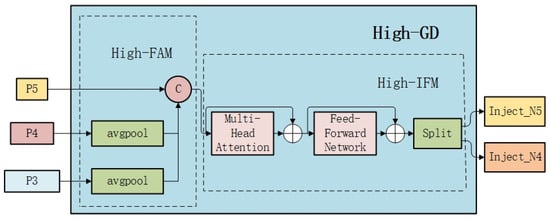 The high-GD module is mainly used to fuse the deep-level feature information of the model to optimize the detection performance of medium and large targets. The efficient integration of high-level information is realized by extracting and distributing the global semantic information of the deep-level features. The exact process is shown in Figure 2.