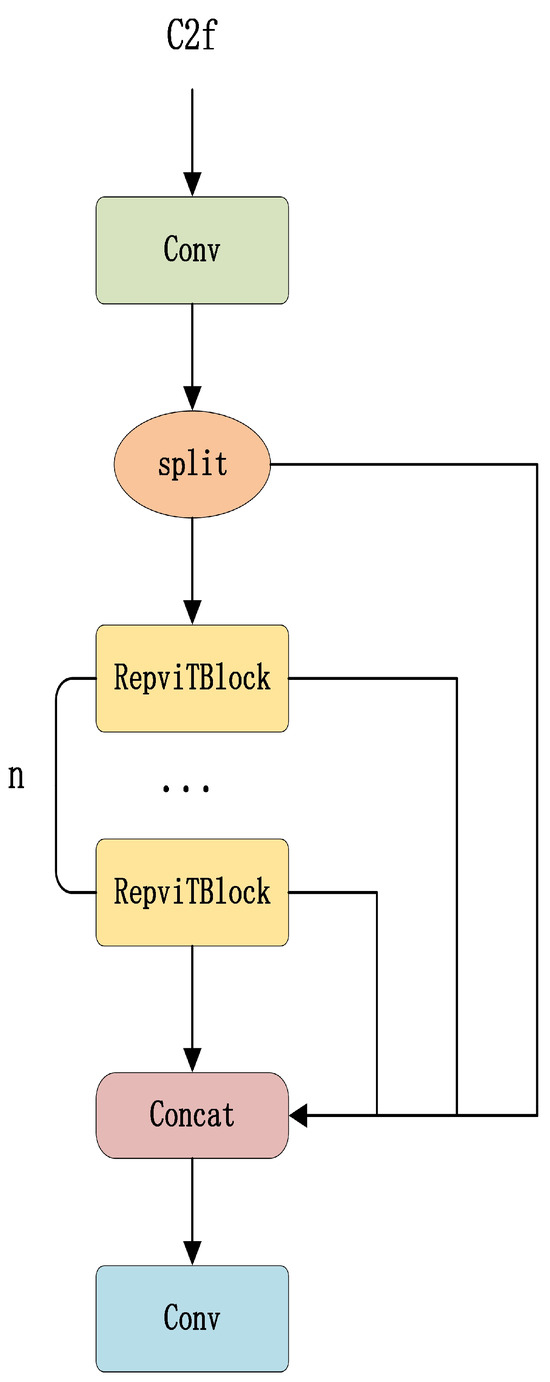 RepViTBlock incorporates the structural reparameterization (SR) strategy, employing a multi-branch structure during training to enhance feature learning. During inference, these multiple branches are fused into a single path, effectively reducing computational complexity while maintaining strong feature expressiveness. This optimization improves detection efficiency, making the model more suitable for real-time applications []. Additionally, to further enhance feature fusion, RepViTBlock integrates a lightweight token mixer and channel mixer. The token mixer, utilizing a 3 × 3 depth-wise convolution, extracts local spatial features to enhance the detection of small targets, while the channel mixer, leveraging a 1 × 1 convolution, facilitates inter-channel information interaction to improve global feature representation. This design not only preserves detection accuracy but also prevents a significant increase in parameter count, allowing the model to achieve stronger feature extraction while maintaining high computational efficiency.