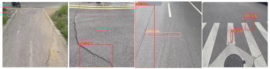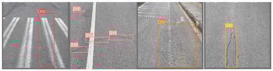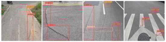 In order to adapt to the characteristics of urban roads in China, this paper selects the Chinese regional road damage data in the RDD-2022 (Road Damage Dataset 2022) [] dataset for model training. This dataset contains two parts: the China_Drone image set and the china_motorcycle image set. The China_Drone image set contains a total of 2401 road damage images, covering 3068 instances of road damage, while the china_motorcycle image set contains 1977 road damage images, covering 4650 instances of damage. All images are labeled with four types of road defects, including longitudinal cracks (D00), transverse cracks (D10), composite cracks (D20), and potholes (D40). Figure 4 shows four typical damage types in RDD-2022. To ensure data quality, some unlabeled road images were excluded from this study. The processed dataset was then randomly split into a training set and a validation set at a 7:3 ratio, with the training set containing 5530 images and the validation set containing 2370 images. Additionally, an independent test set consisting of 500 images, which was not involved in training or validation, was separately allocated to ensure the fairness and objectivity of the evaluation.