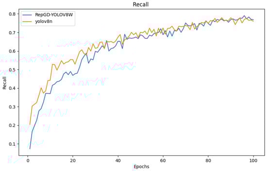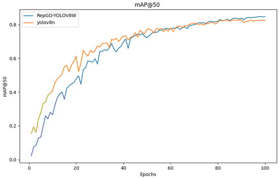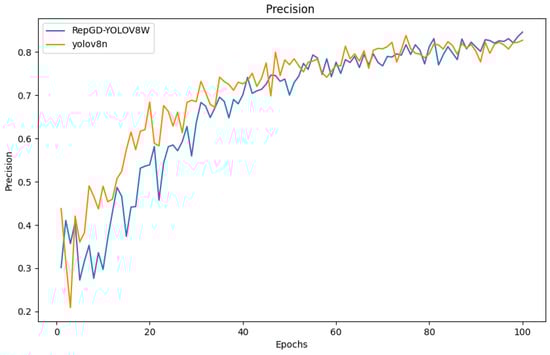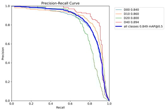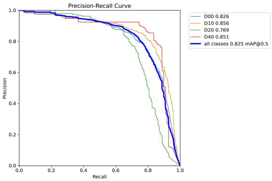 The quantitative analysis results of RepGD-YOLOV8W and YOLOV8n in terms of mAP@50, precision, recall, and precision–recall (PR) curve are shown in Figure 5, Figure 6, Figure 7, Figure 8, Figure 9, Figure 10 and Figure 11. The experimental results show that YOLOv8n converges faster in the early stage of training. However, as training progresses, the mAP@50 of RepGD-YOLOV8W gradually surpasses that of YOLOv8n, maintaining the lead in the later stages, and ultimately achieving a slightly higher mAP@50, indicating superior overall detection accuracy. In terms of precision, YOLOv8n slightly outperforms RepGD-YOLOV8W in the early stage of training but with increasing epochs, and the precision of RepGD-YOLOV8W gradually improves, surpassing YOLOv8n in the later stages and eventually stabilizing. This suggests that RepGD-YOLOV8W has a lower false positive rate, leading to more accurate detection results. Regarding recall, YOLOv8n also dominates in the early stage, with a faster rise in recall rate. However, RepGD-YOLOV8W gradually improves in the later stages and ultimately surpasses YOLOv8n. This demonstrates that RepGD-YOLOV8W can detect more targets, enhancing the comprehensiveness of target recognition. Through the analysis of the precision–recall (PR) curve, RepGD-YOLOV8W outperforms YOLOv8n in overall mAP, achieving an mAP of 0.849 compared to 0.825 for YOLOv8n. In the detection of longitudinal cracks (D00), transverse cracks (D10), composite cracks (D20), and potholes (D40), RepGD-YOLOV8W shows improvements of 1.4%, 0.4%, 3.1%, and 4.3%, respectively. RepGD-YOLOV8W shows more significant improvements in the D20 and D40 categories, mainly because these targets have relatively larger and more distinct morphological features. This model can better utilize multi-scale feature extraction and global information fusion when detecting these larger targets, especially in complex backgrounds, where such targets are easier to detect compared to smaller cracks or fine defects. For smaller targets like D10, although the model shows improvements, the gain is relatively small due to the small size of the features and the complexity of background interference.