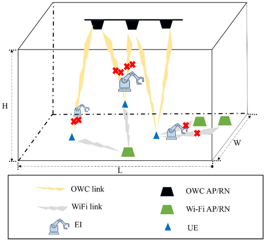 Typically, a localization system comprises three main roles: APs, RNs, and User Equipment (UE) [30]. APs serve as fixed infrastructure points that transmit and receive signals, providing reference information for localization calculations. RNs are positioned at known locations to help determine the locations of UE through localization methods such as triangulation. UE are the devices whose locations are determined, such as mobile phones or other user devices. In addition to these primary components, External Interferences (EIs) may also be present during system operations, especially in a dynamic environment. Although EIs do not communicate directly with the other components, they can affect the accuracy and reliability of the localization system by introducing signal distortions or other disturbances. Therefore, we first consider the dynamic indoor localization environment shown as Figure 1. The room has dimensions of L in length, H in height, and W in width. Inside, different devices are linked through different transmitters through OWC or Wi-Fi connections. In dynamic environments, the presence of EIs can impact signal transmission. As a result, UE may not consistently receive complete RSS data, leading to partial data loss. These incomplete data can significantly affect the accuracy and reliability of the localization process.