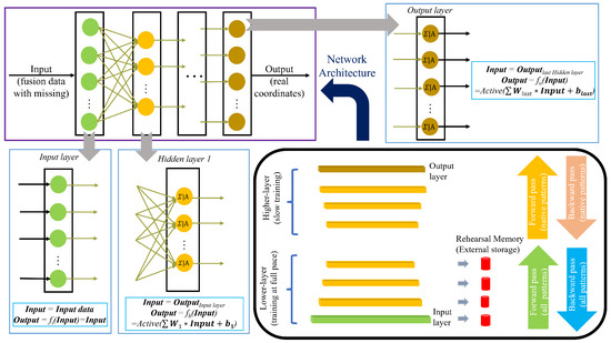 As mentioned above, we propose an improved rehearsal-based CL system for real-time localization. The proposed system is designed with two primary objectives: preventing the catastrophic forgetting of previous data and ensuring high localization accuracy for new data. The first objective is addressed through the rehearsal strategy detailed in Section 2. Traditional rehearsal-based CL methods typically focus on replaying data at the input layer, while the limited existing research on CL for localization emphasizes rehearsals at the chosen intermediate layer. To further enhance localization accuracy, our system extends the rehearsal policy to multiple intermediate layers, rather than relying on a single layer. In addition, to reduce computational complexity, the processing speed in the upper layers—where most of the computational load occurs—is deliberately slowed down. The second objective, maintaining localization accuracy for new data, is achieved by initializing the parameters in the lower layers using a partially trained NN based on the new dataset, which ensures that the system remains efficient while effectively integrating new information. The whole process will be explained further. First, at time t, a trained based on old data is determined. The NN is structured into three main types of layers: the input layer, which receives the initial data; hidden layers, where complex computations and feature extractions occur; and the output layer, which produces the final result or prediction. Each layer comprises multiple neurons, which are the basic units that process the information. In a traditional fully connected NN, also known as a dense network, every neuron in one layer is linked to every neuron in the following layer. These connections allow for the full transfer of information from one layer to the next. Specifically, the output from each neuron in a layer is passed through an activation function, which introduces non-linearity into the model, and then this processed output becomes the input for the neurons in the subsequent layer. For the input layer, let Input represent the input data (which in this case are the fusion data with missing values), and the output is given by , where denotes the activation function. For the hidden layer, the output is calculated as , where W refers to the weights connected to each neuron, and b is the bias term. An example of this is seen in the first hidden layer, as illustrated in Figure 2. The output layer functions similarly to the hidden layers. This whole process is generally as shown in the upper left corner of Figure 2. The dense connections and layered structure enables the NN to learn and represent complex patterns within the data.