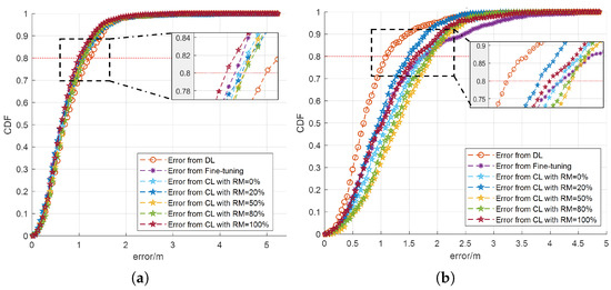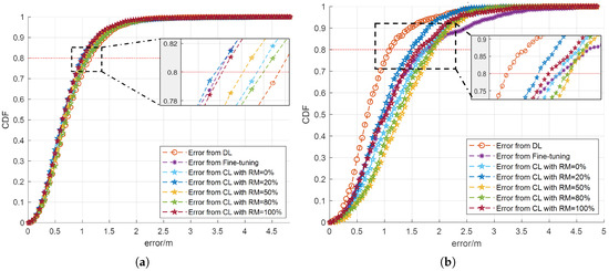 As shown in Figure 4, similar observations are made as in Figure 3, with the proposed CL approach demonstrating the best performance among the presented rehearsal proportions at 20%. For the new dataset, CL networks convergence faster compared to the DL network trained exclusively on the new dataset, regardless of the rehearsal memory size. This highlights the CL approach’s superior ability to integrate new information while preserving prior knowledge. Notably, for 80% receivers, the localization error for the CL network with is lower than that of the fine-tuning network. These findings, shown in Figure 4a, underscore the advantages of the CL approach in dynamic environments for the new dataset. It can be noticed that the results from fine-tuning and CL with , , , , and are very similar. This is because in conditions where only small changes occur in the environment, indicating that the rehearsal data are similar to the previous ones and further implying that the new dataset has minimal differences from the old one, fine-tuning and CL may achieve similar accuracy performance. For the old dataset, as shown in Figure 4b, the proposed CL approach with 20% rehearsal proportion performs higher localization accuracy and also avoids catastrophic forgetting. The MSE results are shown in Table 5.