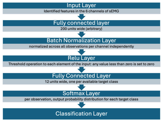 The same dataset described in Section 3.1 was utilized to train a neural network. The raw input data consisted of time-series signals from six channels sampled at 1 kHz and labeled with ground-truth motion categories. These data were segmented into rolling windows of a predetermined length. For instance, a window size of 150 samples corresponded to 150 ms of time-series data per window at a sampling rate of 1 kHz. Consequently, each trial was processed into approximately 50,000 to 100,000 rolling windows, depending on the window size. For each window, features were extracted by calculating a single linear least-squares best-fit coefficient, which served as the input to the neural network. The network itself consisted of seven layers, beginning with an input layer and concluding with a classification layer. A diagram of the neural network structure is shown in Figure 2.
