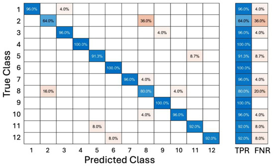 where is the objective function, is the location of the lowest mean, and is the value of the lowest mean. This process was executed iteratively until a local minimum of the misclassification rate was reached. By stepping through 30 iterations of generational optimization, and applying different parameter combinations, Bayesian optimization yielded improved results as the classification error decreased with each iteration. As a result of the optimization, the accuracy of the trained model increased to 92.9% across all test cases, as shown in the confusion matrix in Figure 3, with a prediction speed of approximately 25,000 classifications per second. The highest-performing model used with a city-block distance metric and an inverse distance weight.