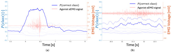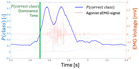 The neural network classification method demonstrated the ability to identify both the predicted class of each data point (as described in Section 3.3, where data points were rolling windows of variable length) within the time series and the associated probability distribution, , for each prediction. The algorithm calculated the likelihood that each data point corresponds to a specific class. As illustrated in Figure 4, the probability of correct classification increases not only before the expected motion—accounting for the EMD delay of 50 ms to 200 ms following the initial electrical activation of the muscle group—but also before the sEMG signal indicates muscle activation of the primary agonist.