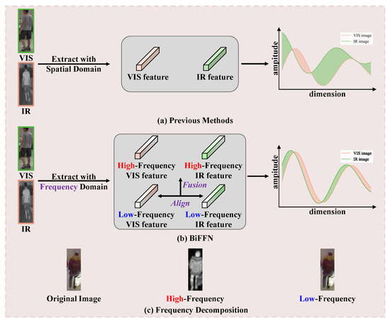 Building on this foundation, we propose a novel middle-modality feature generation method for VI-ReID, called the bi-frequency feature fusion network (BiFFN). Our motivation is illustrated in Figure 1a,b. BiFFN integrates high- and low-frequency domain features through three key modules: the frequency space enhancement (FSE) module, the deep frequency mining (DFM) module, and the cross-frequency fusion (CFF) module. Using discrete wavelet transform (DWT), high- and low-frequency features are extracted from the input. The FSE module has two branches: frequency enhancement, which uses high-frequency information to enhance low-frequency features, and spatial enhancement, which employs convolution to improve feature representation. The DFM module then processes these features to leverage edge information from the high-frequency domain and global structural information from the low-frequency domain. Finally, the CFF module aligns and fuses low- and high-frequency features, generating a middle-modality with comprehensive and effective information. To effectively align VIS, IR, and middle features, we introduce the uniform modality center (UMC) loss, which ensures balanced feature distances, promoting better alignment and integration of different modalities.