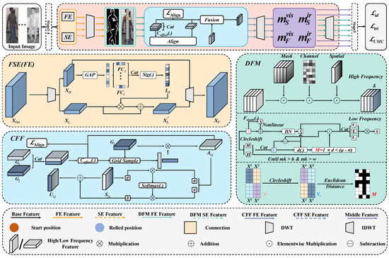Image-level VI-ReID methods reduce modality differences by converting images between VIS and IR. Some GAN-based approaches generate images that retain identity but vary in modal styles. However, the lack of paired VIS-IR images has made these generated images less reliable. Li et al. [1], Wei et al. [12], and Zhang et al. [13] proposed lightweight networks to generate middle modalities, which alleviated some modality gaps but still differed significantly from VIS/IR modalities. Feature-level methods aim to reduce modality gaps by mapping features into a common space. Some methods [14,15,16] have used CNN/VIT backbones for feature extraction. Zhang et al. [6] proposed a diversified embedding expansion network (DEEN) to learn feature information through diversified embeddings, while Qiu et al. [17] generated middle modalities by learning high-order structures. However, relying solely on spatial-domain information makes it challenging to properly distribute and map features in the common space. Unlike traditional feature-level methods, we introduce frequency-domain information in an innovative way and combine it with spatial-domain information to form a new feature representation. Traditional methods often struggle to generate sufficiently discriminative middle features from spatial-domain information alone. By incorporating frequency-domain data, and taking into account the beneficial information contained in both high- and low-frequency components, we apply distinct processing techniques to capture richer feature representations. When these features are fused with spatial information, the model becomes better at learning discriminative and robust features in the common space, overcoming the main limitations of existing approaches. Our method provides a novel and valuable contribution to the field of VI-ReID.