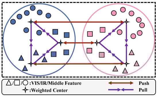 As shown in Figure 4, we first calculate the weighted center for each identity and modality. Given the feature vector set for label l and modality m, the weighted center can be expressed as follows: