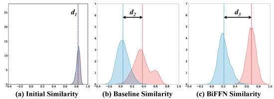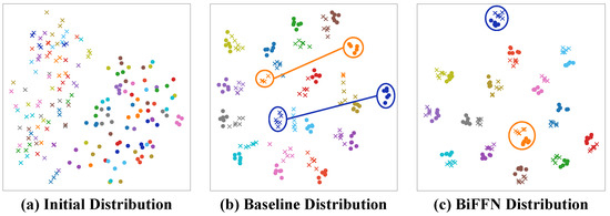 As shown in Figure 6a–c, compared to the initial feature distances and baseline feature distances, our proposed BiFFN significantly separates the inter-class distances and intra-class distances (). This indicates that our method can effectively reduce the modality gap, achieving better performance.