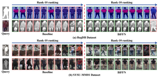(a,b) The Rank-10 retrieval results obtained by the baseline method and the proposed BiFFN method on the SYSU-MM01 and RegDB datasets.
