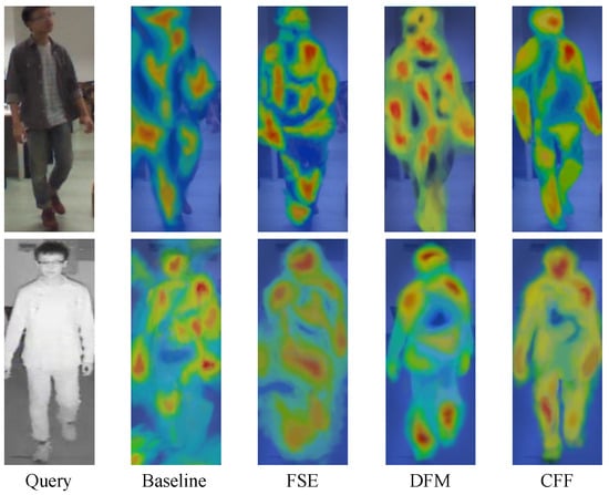 To further demonstrate the impact of each module on the network, we performed heatmap visualizations on the network after incorporating the modules in Figure 9. Both for VIS and IR images, the network with the FSE module applied showed improved feature extraction for the person, with a stronger focus on the subject compared to the baseline. After further processing through the DFM module, the VIS image exhibited regional attention to the global structure of the body. For the IR image, although less pronounced than in the VIS image, there was still an enhanced treatment of the body’s global structure. However, in the DFM module, the VIS image showed some over-attention to certain areas. This issue was resolved after the CFF module was applied, as the final heatmaps, both for VIS and IR images, displayed a more balanced focus on the human body, with a well-controlled attention scope. This visualization further clarifies the role of each module in the network and its overall effectiveness.