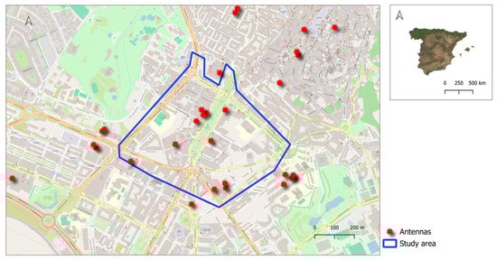 The study was conducted in the commercial district of a medium-sized city located in the west of Spain, specifically in Cáceres, which has an approximate population of 96,117 inhabitants according to the 2021 census. The study area covered an area of 0.37 km2 and is notable for being the busiest commercial zone within the city. The population density in the study zone varies according to the schedule, reaching maximums during business hours. In the area where this study was performed, there were 25 mobile telephony antenna sites, in many cases shared by different technologies. Of these, 12 operated in the 800 MHz band, 28 in the 900 MHz band, 21 in the 1800 MHz band, 17 in the 2100 MHz band and 3 in the 2600 MHz. Their locations on the city map, obtained from data provided by the Ministry of Energy, Tourism, and the Digital Agenda [] are shown in Figure 1. The FM and Television antennas are located on the outskirts of the city, specifically there are five locations with different antennas in the frequency band from 87.5 to 108 MHz located to the south, north and west of the city [].