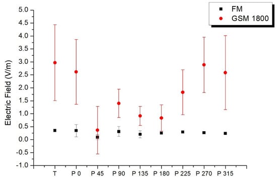 In order to obtain shielding coefficients of the human body, measurements were conducted using the PEM positioned at the hip and varying the orientation of the exposure meter every 45 degrees at a location in the University of Extremadura. Figure 3 depicts a plot of the electric field alongside the standard deviation obtained for each orientation, as well as the values obtained with the PEM positioned on the tripod, for two of the six emissions considered in our study: FM and GSM 1800 (DL). This figure presents the average value of the electric field strength (V/m) from the 30 measurements taken on the tripod (T) and at each orientation α, with 0 degrees aligning with the north direction. For the three emissions, variations are observed between the values obtained on the tripod and those obtained with the PEM in different orientations. The lowest values in both cases are obtained at the 45-degree orientation, while the highest values are obtained when the PEM is not shielded by the human body; in such cases, signal reception is even higher than that obtained with the exposure meter measuring on the tripod.