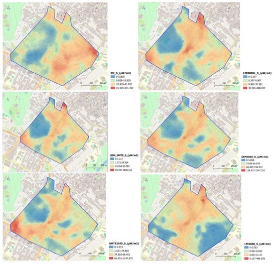 Interpolated map depicting the power density (μW/m2) for various frequency bands using the kriging method.