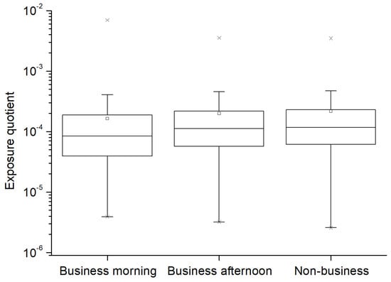 Box-and-whisker plot of the exposure quotients Qth in business morning, afternoon, and non-business hours.