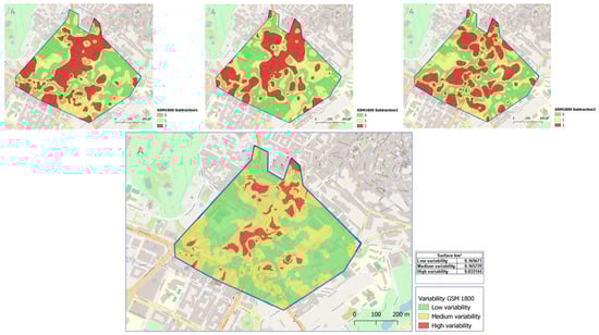 As seen in the final map, for the GSM 1800 (DL) frequency, the area of greatest temporal variability corresponds to a wide pedestrian zone, free of buildings, where emissions do not seem to be shielded. It is an area to be considered, as it corresponds to a zone with a higher pedestrian flow, which is a sensitive part of the city. It can be stated that the area considered to have high temporal variability within the study zone is not very extensive, accounting for 9.2% of the total area considered. According to the results obtained, it can be affirmed that the surface area with high temporal variation is low considering the time intervals considered in this study. The area of low and medium variability is similar in percentage, approximately 46% of the total area for each.