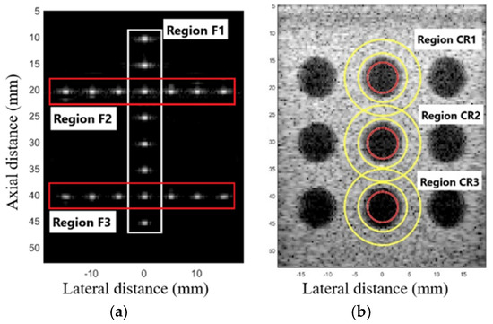 The parameter of the full width at half maximum (FWHM) was used to evaluate the geometric distortion in the F1, F2, and F3 regions, as shown in Figure 1a, measuring the FWHM in the axial (FWHMAx) and lateral (FWHMLat) axes. The average values of FWHMLat were compared to the point of interest with an actual dimension of 0.10 mm in diameter [30]. For quantitative analysis, the contrast ratio (CR) was measured in the regions CR1, CR2, and CR3, as shown in Figure 1b, representing the difference between two areas: the mean amplitude of the phantom cyst (φcyst) and the background (φback), as presented in (22) [30].