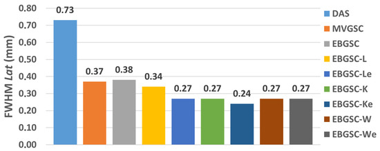 The EGSCW, EGSCWe, EGSCLe, and EGSCK equally decrease the average FWHMLat, obtaining a reduction of 0.46 mm (63%), compared to the DAS method, with 0.10 mm (27%) and 0.09 mm (25%) compared to EGSC and GSC techniques, respectively.