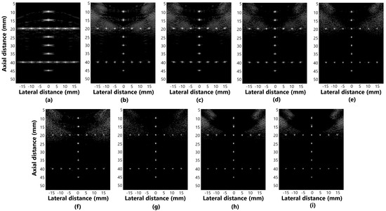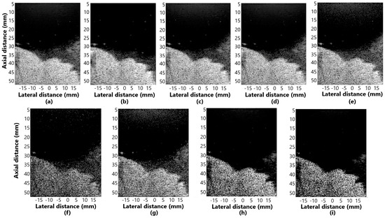 Figure 7a–i shows the displayed images for simulation of contrast for the methods: (a) DAS, (b) GSC, (c) EGSC, (d) EGSCL, (e) EGSCLe, (f) EGSCK, (g) EGSCKe, (h) EGSCW, and (i) EGSCWe.