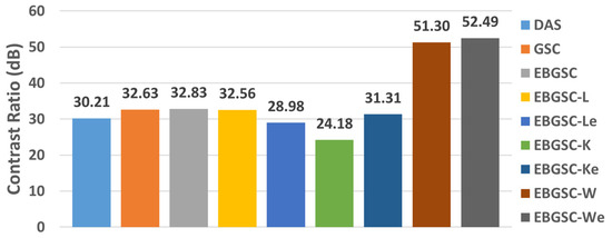 The EGSCWe technique generated a contrast mean value of 52.49 dB, representing an average contrast improvement of 19.66 dB (60%), 19.86 dB (61%), and 22.28 dB (74%) compared to EGSC, GSC, and DAS, respectively. We noticed that the EGSCWe improved the performance of the EGSCW contrast by 1.19 dB, approximately 2.3%.