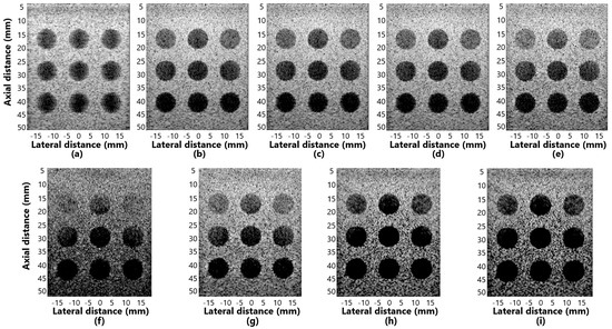 The displayed images for contrast analysis in fetal phantom for (a) DAS, (b) GSC, (c) EGSC, (d) EGSCL, (e) EGSCLe, (f) EGSCK, (g) EGSCKe, (h) EGSCW, and (i) EGSCWe.