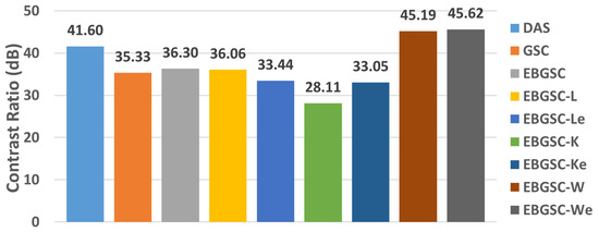 The EGSCK technique presents the worst contrast value on average, with a reduction of 8.65 dB (26.3%), 8.45 dB (26%), and 6.03 dB (20%) compared to the EGSC, GSC, and DAS, respectively. Also, the EGSCKe shows a slight contrast improvement of 1.1 dB (3.6%) compared to the DAS method.