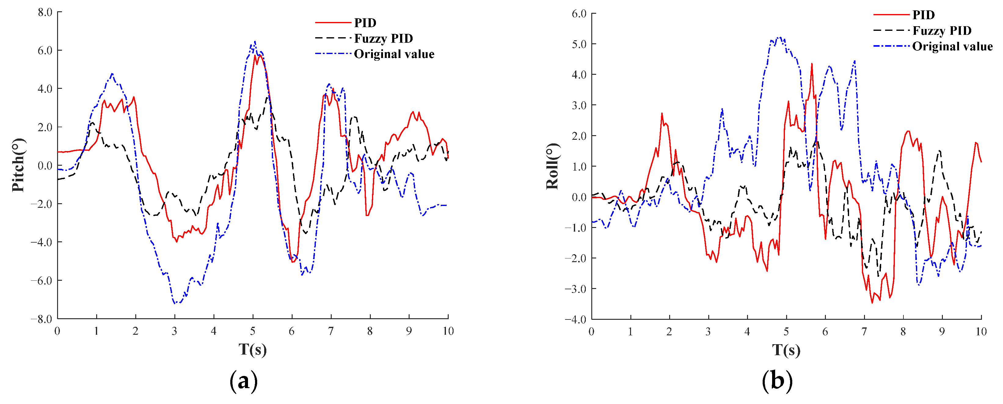 - Static and dynamic tests on the prototype revealed an inclination adjustment error of 1.7° and an average leveling time of 3.6 s across eight inclination states. With fuzzy PID control, the prototype’s mean inclination values were 3.8°, 2.6°, and 1.6°, with standard deviations of 2.1°, 1.4°, and 0.8°, respectively. This adaptive leveling system exhibited superior performance, confirming the feasibility and accuracy of the proposed method. The leveling process activates when inclinations exceed ±1.5°, maintaining the platform’s attitude angle within ±3°, thus achieving stable dynamic leveling.