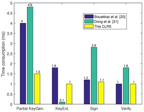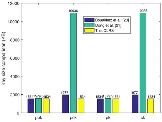 This section compares the efficiency of the CLRS scheme from two aspects: key size and time consumption. Here, two related CLRS schemes in [20,21] were selected for comparison.