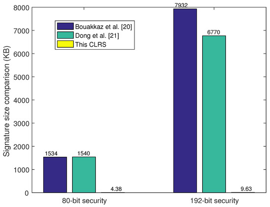 Key size affects the system storage and program implementation efficiency, so a smaller key size leads to a more efficient CLRS scheme. The key size comparison results are shown in Table 2 as well as Figure 1 and Figure 2. In Ref. [21], the key sizes of , , , and are a little bigger than those in the proposed CLRS scheme as the parameter k is set at . From the results of the theoretical analyses, the key size in the proposed CLRS is smaller than that in the other two CLRS schemes. Meanwhile, the system parameters were set and executed on a Windows 11 laptop with Intel Core i7-9700 CPU 3.0 GHz and 16 GB RAM. Here, two security levels were selected according to the setting principle in [24]; the 80-bit (192-bit) security level was equal to a 512-bit (1024-bit) security level in a traditional cryptographic algorithm. The 80-bit security level was defined with , , , and , and the 192-bit security level was defined with , , , and . Here, parameter k was set at and for 80-bit and 192-bit security levels, respectively. With these parameters, the key size of these three schemes was computed, and the comparison of the results is shown in Table 3. These results are also shown in Figure 1 and Figure 2. These two figures visually show the results of the proposed CLRS scheme compared with the two similar CLRS schemes in terms of key and signature size. The key sizes of and in the proposed CLRS are much smaller than those in Ref. [21], and the signature size is much smaller than that in the other two CLRS schemes.