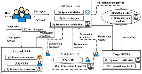 - CLRS: The step “5.1, 5.2, ⋯" represents the singing processes in different CCLSs. When the cold-chain goods are transported from the producing area to a supermarket, the data exchange in different parts should be recorded in the central server. Meanwhile, the related operators sign this transaction with their own keys . Note that one operator serves as the ring member in one BCCLS, which can represent the ring to sign this transaction. This ring signature mechanism can guarantee the signer’s anonymity.