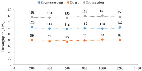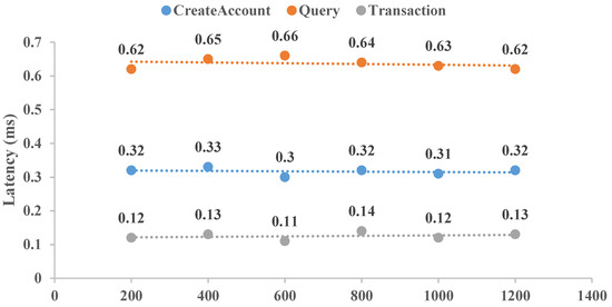 To reflect the application of this CLRS scheme, a distributed BCCLS with five nodes was established with Hyperledger Fabric. Here, two items of transaction throughput and latency were selected and executed. The throughputs of “CreatAccount”, “Query”, and “Transaction” were determined 10 times, and the averaged results are shown in Figure 5. Meanwhile, the performance results of transaction latency for these same aspects are shown in Figure 6. “CreatAccount” represents the generation rate of user registration, “Query” represents the number of queries of cross-chain transaction origination, and “Transaction” represents the establishment of the transaction amounts. These results show that the BCCLS system equipped with this CLRS scheme can remain stable with increasing transaction numbers. For these three aspects, “Query” is executed with high throughput by the low transaction latency, and “Transaction” is executed with low throughput by the high transaction latency. Moreover, cold-chain logistics data are essential for commodity safety, route optimization, and scientific research. Studying post-quantum security cryptographic algorithms is necessary to think ahead about IoT network security in the age of quantum computers. Meanwhile, the proposed CLRS scheme is also fit for other data-sharing needs in finance, the Internet of Vehicles, and the Internet of Medical Things.