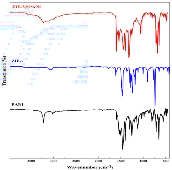 FTIR spectra of PANI, synthesized ZIF-7 and ZIF-7@PANI composite.