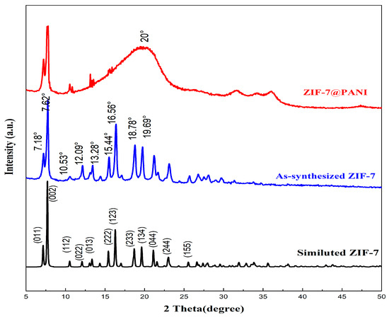 The three samples were analyzed by the powder XRD technique. The strong similarity between the simulated and synthesized XRD patterns suggests the production of pure ZIF-7, free from impurities or additional phases (Figure 2). Indexing of the diffractogram reveals significant alignment with the corresponding lattice parameters and space group (R-3). Notably, the observed broadening of the diffraction peaks indicates the formation of smaller ZIF-7 crystals. Figure 2 displays the XRD patterns for the ZIF-7@PANI composite, with peaks at 7.18°, 7.62°, 10.53°, 13.28°, 15.44°, and 19.69° (in 2θ), confirming the presence of ZIF-7 crystals with a cubic structure (R-3) [34,36,40]. Additionally, the peak at 20° confirms the inclusion of PANI in the composite, validating the presence of semi-crystalline PANI planes [41].