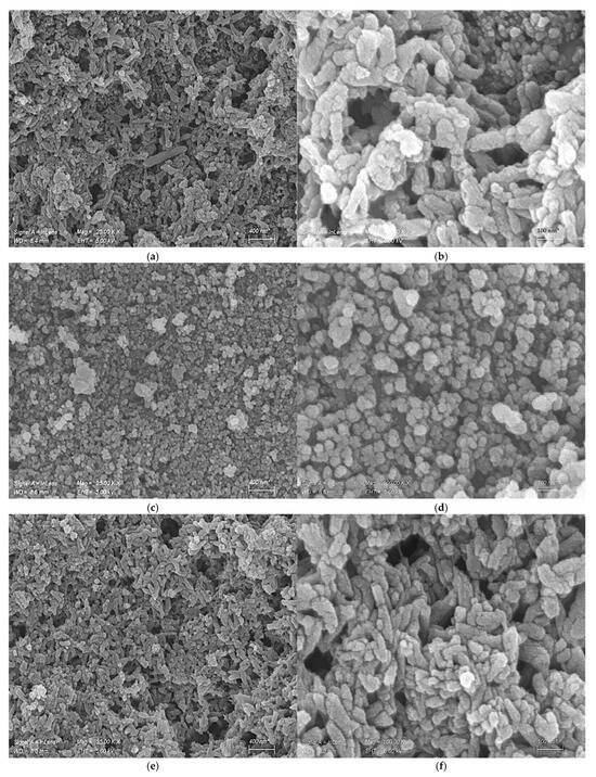 SEM images of PANI/SPCE (a,b), ZIF-7/SPCE (c,d), and ZIF-7@PANI/SPCE (e,f). Images (a,c,e) are taken at 25,000× magnification with a scale bar of 400 nm, while images (b,d,f) are taken at 100,000× magnification with a scale bar of 100 nm.