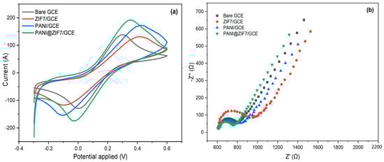 As shown in Figure 4a, the cyclic voltammogram (CV) of the bare GCE exhibited clear and reversible redox peaks. After functionalizing the working electrode surface with the ZIF-7 matrix, a slight reduction in the electron transport rate was observed at the modified electrode interface, leading to a decrease in peak current compared to the bare electrode. This reduction can be attributed to the relatively low conductivity of ZIF-7, as discussed by Butler et al. (2017) [42]. In contrast, the PANI-modified electrode displayed increased current, due to the conductive nature and fast charge transfer capabilities of polyaniline. Notably, the PANI@ZIF-7-modified electrode displayed the highest current for redox peaks, indicating that combining ZIF-7 and PANI into a mixed matrix enhances electron transfer at the electrode surface. This improvement is due to the high conductivity of PANI and the considerable specific surface area of ZIF-7, making it a suitable choice as an electrochemical sensing platform.
